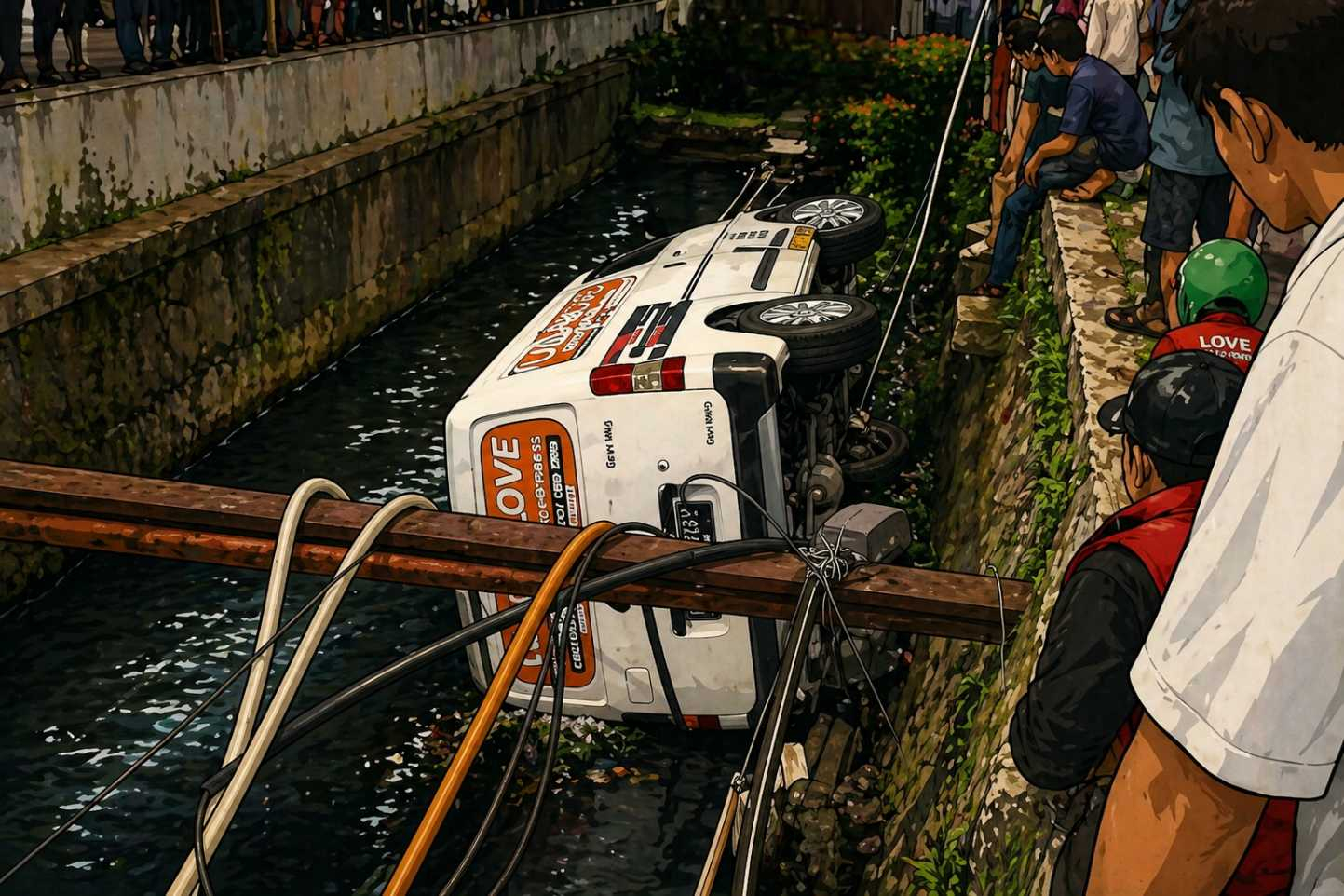 Akibat tarikan gas yang spontan, mobil meluncur tak terkendali, menghantam pembatas jalan, dan langsung terjun bebas ke dalam aliran kali yang berada tepat di pinggir jalur tersebut.